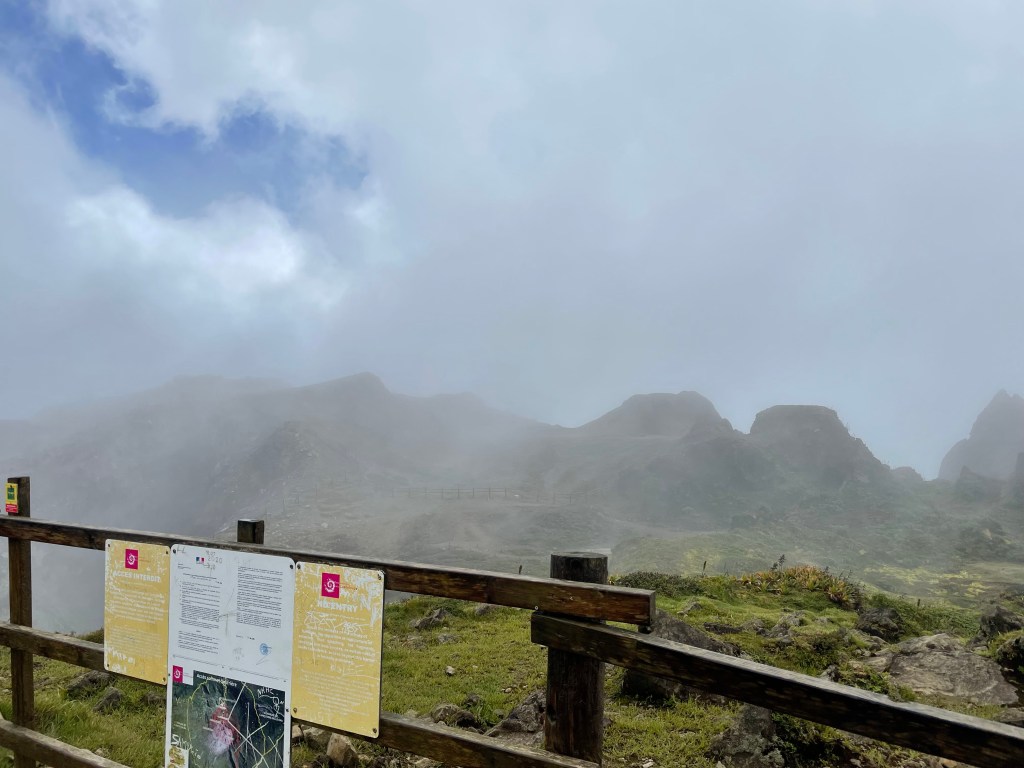 Le lendemain nous sommes partis faire l’ascension de la Soufrière, le volcan guadeloupéen. Attention il se situe dans le parc national donc il est interdit d’y aller avec un chien. La randonnée se fait normalement en 3h mais nous avons mis plus de 5h. J’ai trouvé le chemin difficile, même s’il est faisable, parce que de nombreux cailloux et racines se trouvent au milieu du chemin. Une fois arrivés en haut nous avons été accueillis par une grosse averse et un vent violent et le cratère se trouvait évidemment dans les nuages. Nous avons été déçus de ne pas pouvoir s’approcher du cratère comme c’était possible auparavant (Nicolas avait déjà fait l’ascension il y a quelques années). La promenade nous a quand même permis de voir la grande faille qui traverse le volcan et d’avoir une jolie vue sur la côte.