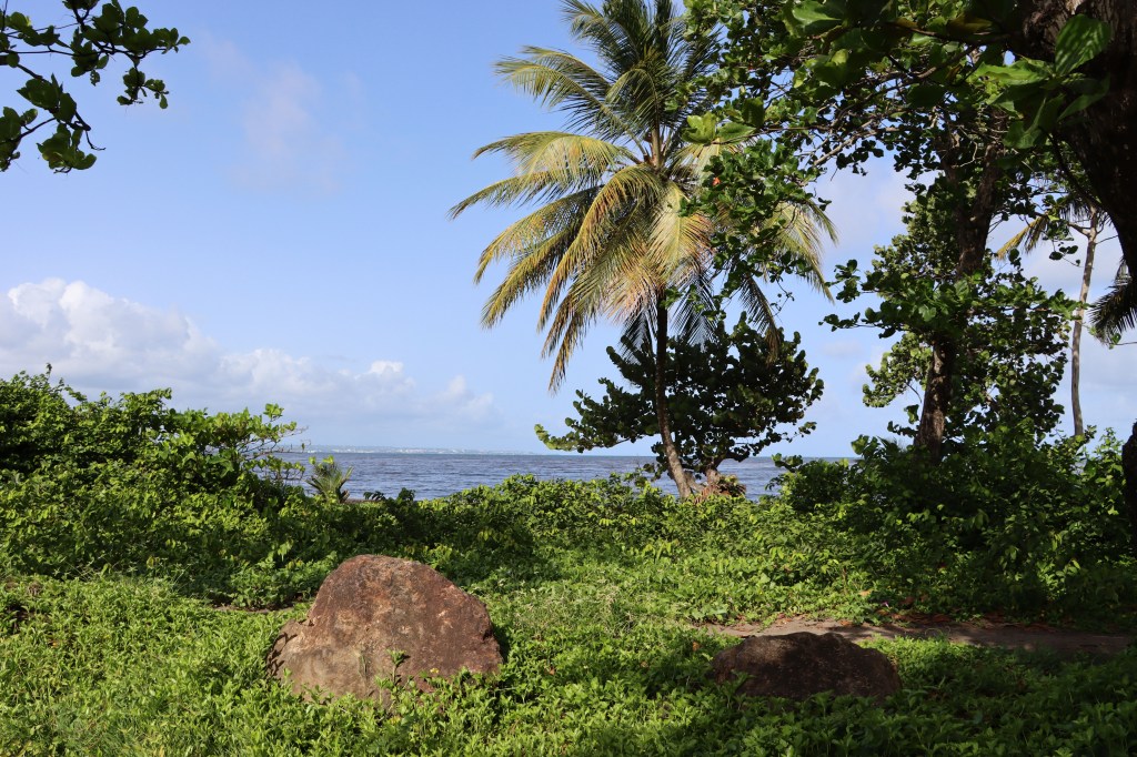 Nous avons donc pris la direction de la plage des Roseaux à Capesterre-Belle-Eau. Nous avons été un peu déçus par cette plage qui avait quelques sargasses (les algues qui envahissent les Caraïbes) et par les jetées en pierre qui enlèvent le côté « naturel » de la plage. Elle reste quand même très jolie avec les nombreux cocotiers qui s’y trouvent.