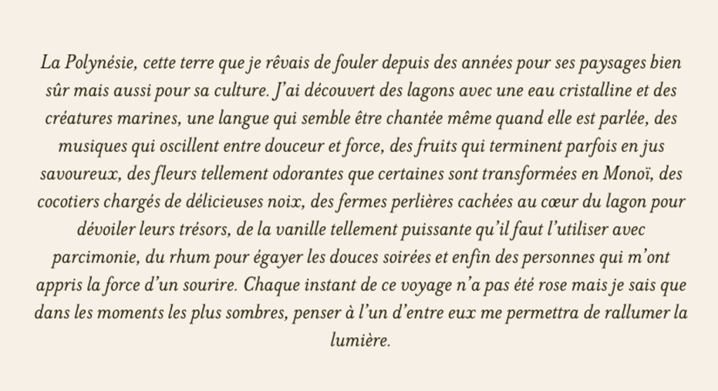 Pour conclure ces articles sur la Polynésie, je vous propose ces quelques mots que j’ai écrit pour les mettre au dos de notre album photo :