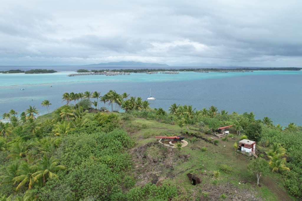 Il faut savoir que Bora Bora est mondialement connue parce qu’elle a été mise sous les feux des projecteurs lors de la 2ème guerre mondiale. En effet, à la suite de l’attaque de Pearl Harbor, les Américains ont cherché un moyen de ne pas perdre le contact avec l’Australie et la Nouvelle-Zélande et Bora Bora était un endroit idéal pour déployer des forces armées. Ils ont alors construit un aéroport (le 1er en Polynésie), des routes, des bunkers et ils ont placé des canons pour les protéger. Bora Bora est devenu l’un des principaux centres d’approvisionnement à cette période-là. Il reste des vestiges de cette période comme les canons que nous sommes allés voir tout au nord de l’île. L’entrée est payante (il y a une petite cabane à l’entrée où la dame indique l’entrée du sentier).