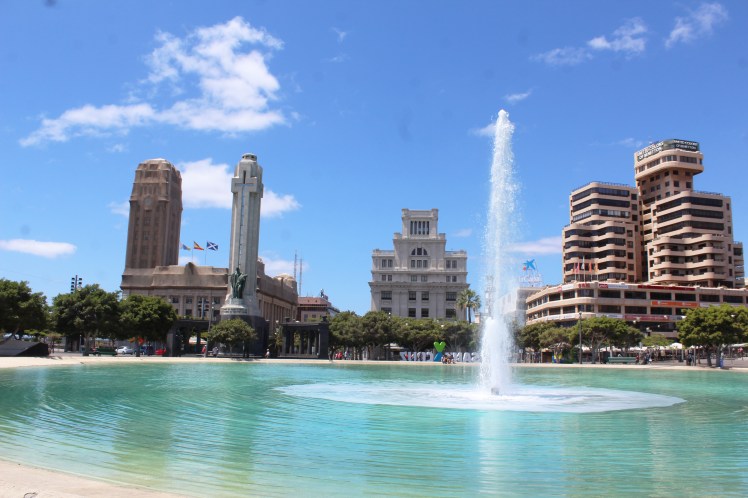 Nous nous sommes ensuite rendus à la plaza de España où se trouve le monumento a los caidos qui est le monument aux morts. Juste derrière se trouve l’hôtel de ville (cabildo insular), le bureau de Poste (oficina de correos) et le centre commercial Olympo. Au centre de la place se trouve une fontaine avec un jet d’eau qui viens rafraichir l’atmosphère.